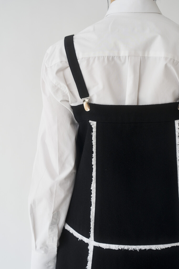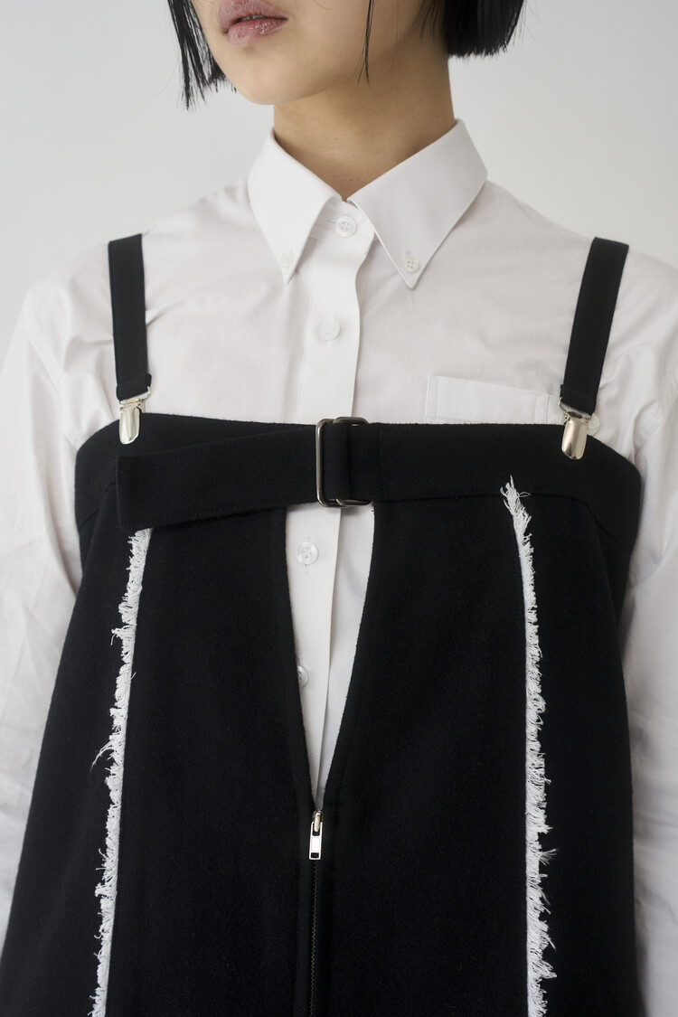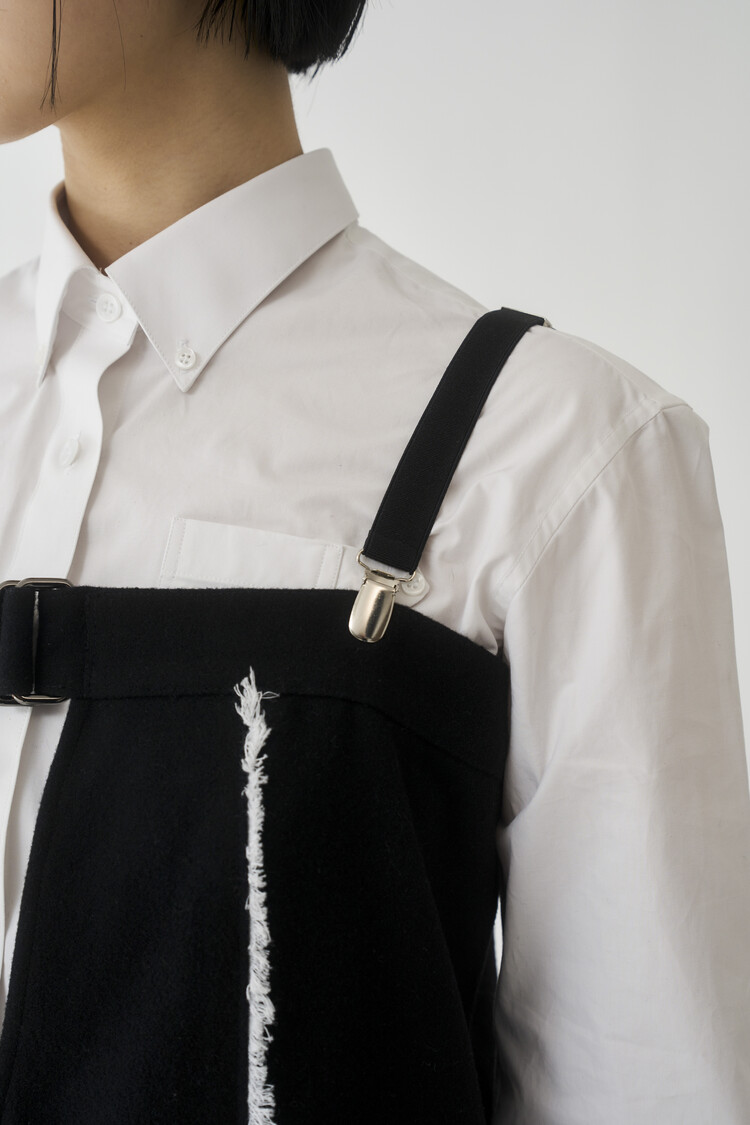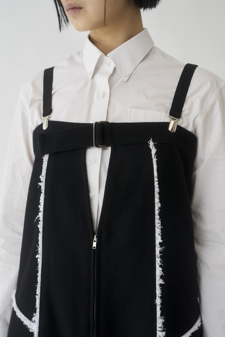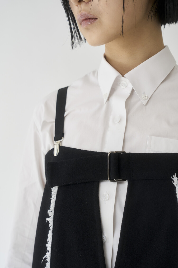 - The front belt adjusts around the chest, and the tensioned suspenders allow for flexible adjustment.