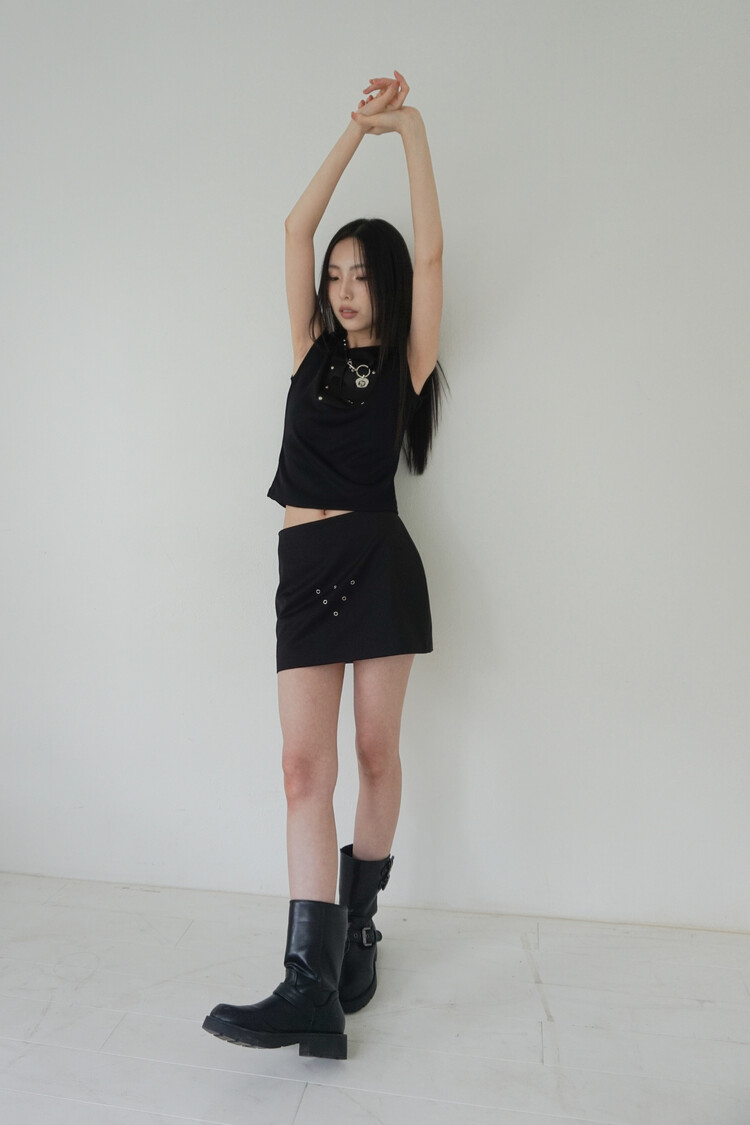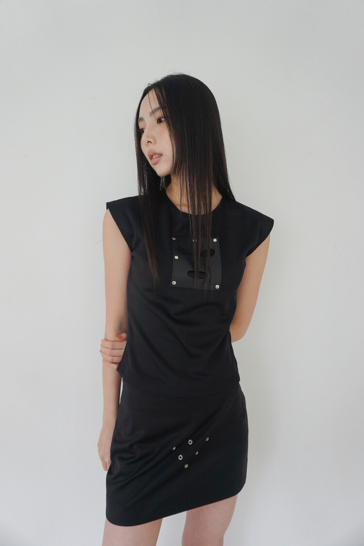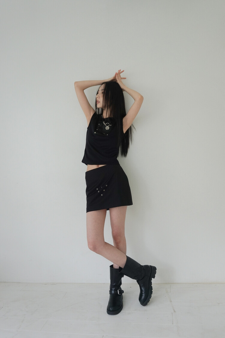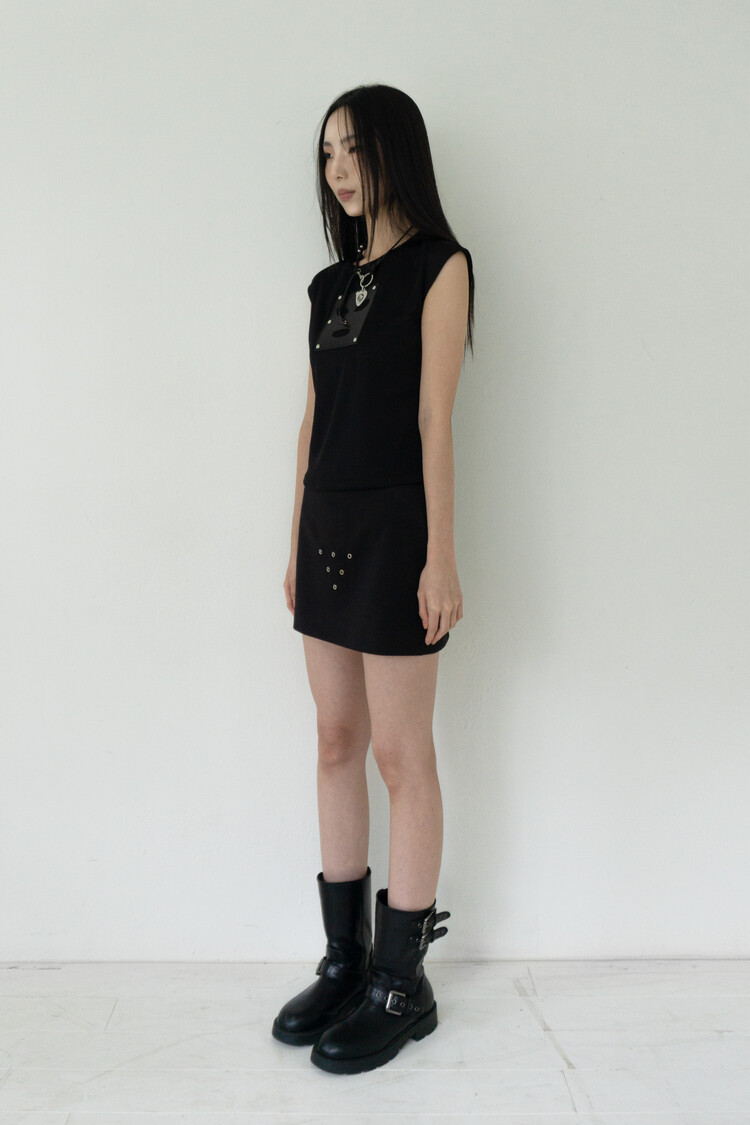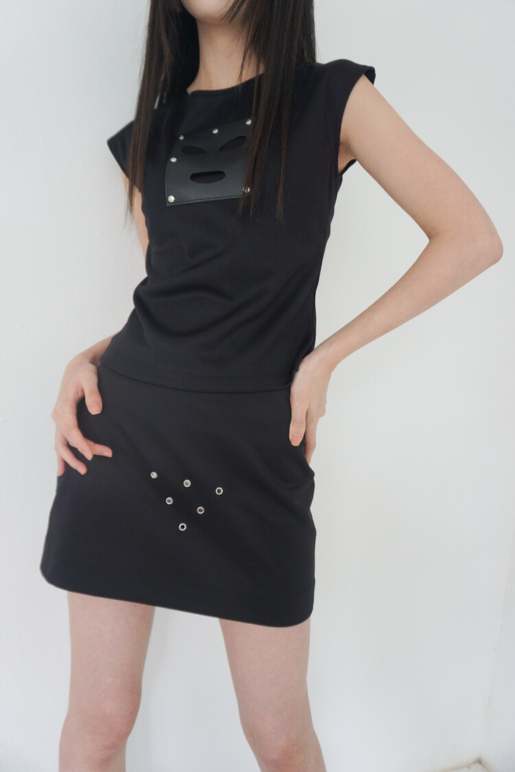 - Sleeveless top featuring a natural cowhide patch cut into the shape of a mask