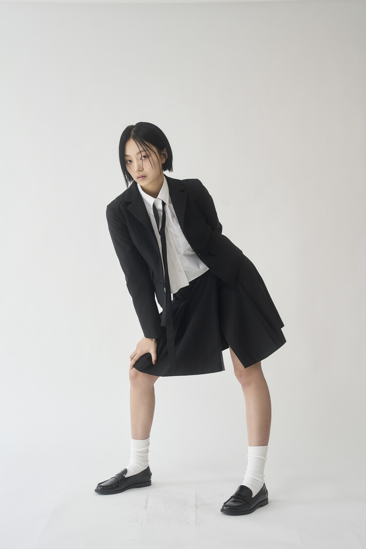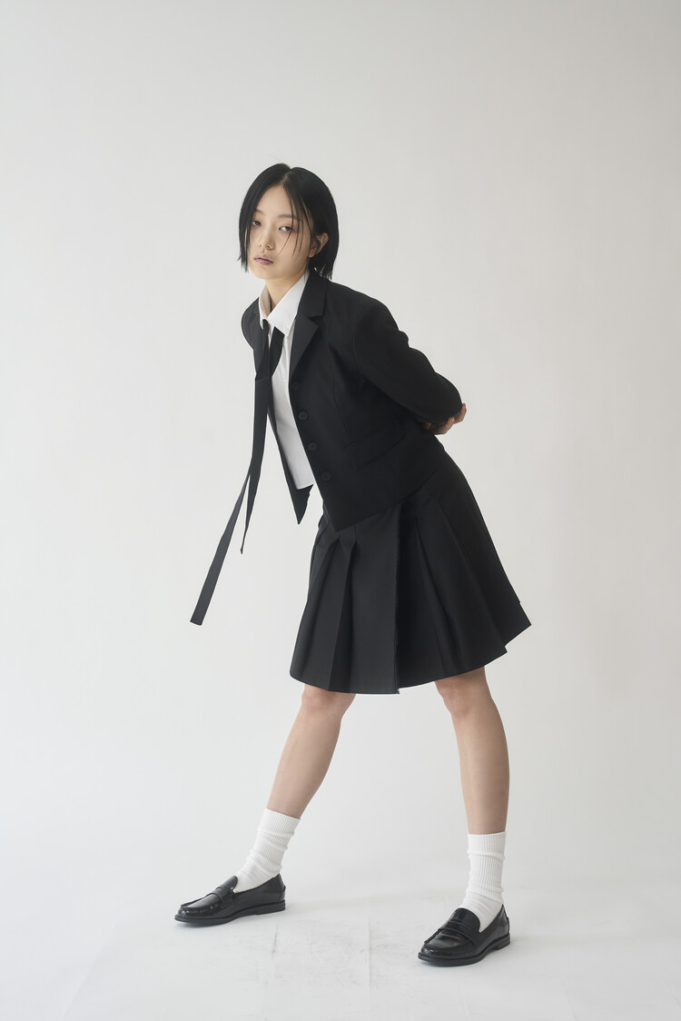 - Inspired by the Scottish kilt garment, the front hem has a unraveling fabric detail.